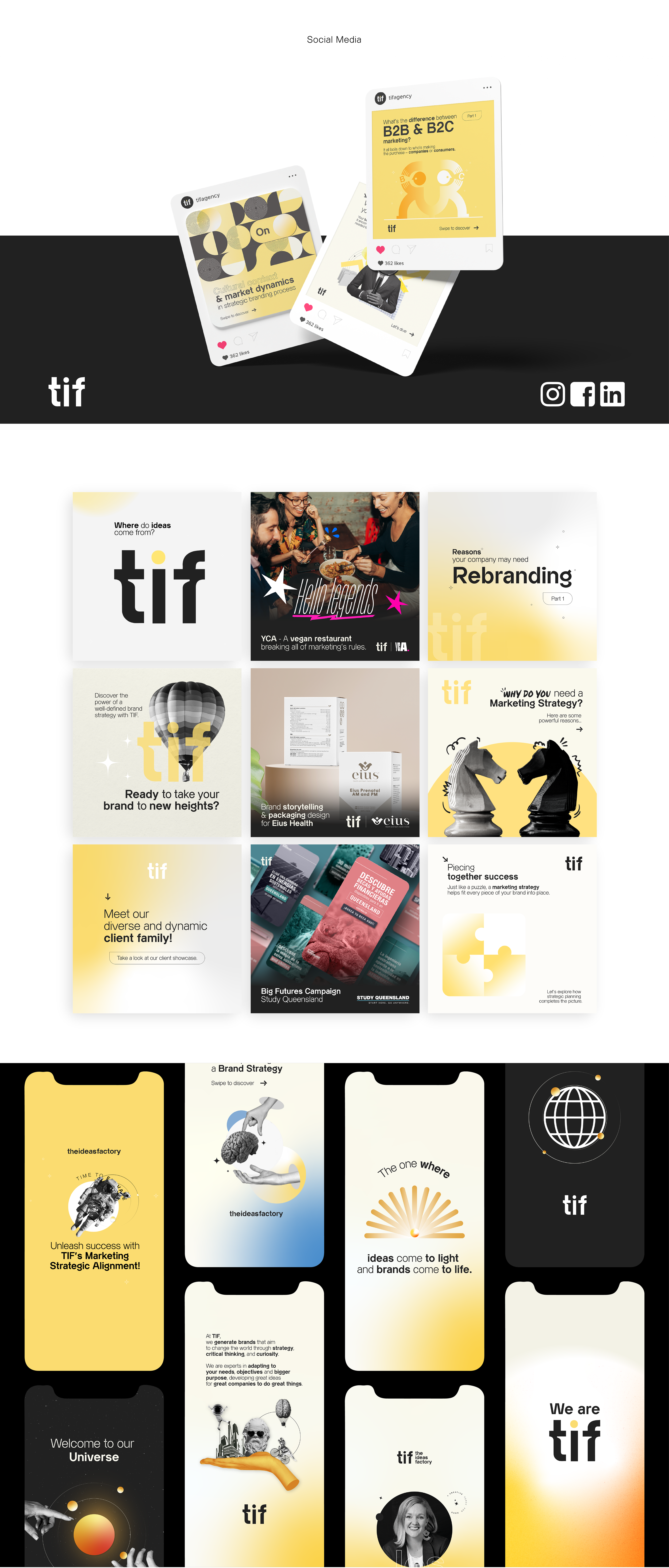 We turned The Ideas Factory’s logo and colors into a complete, cohesive brand system. By defining clear rules for collages, animations, typography, and layouts, we created a strategic identity that balances creativity with consistency.